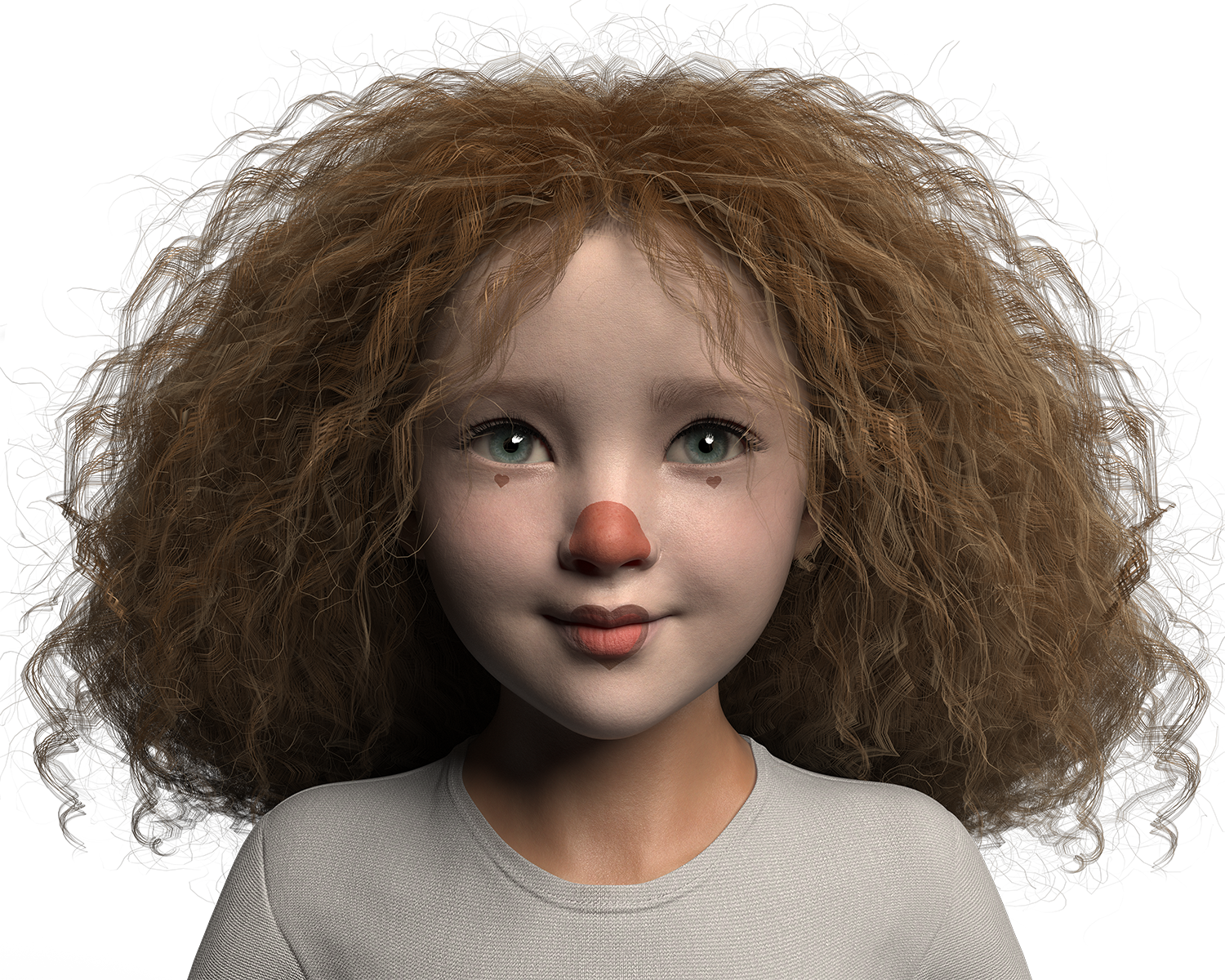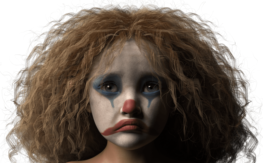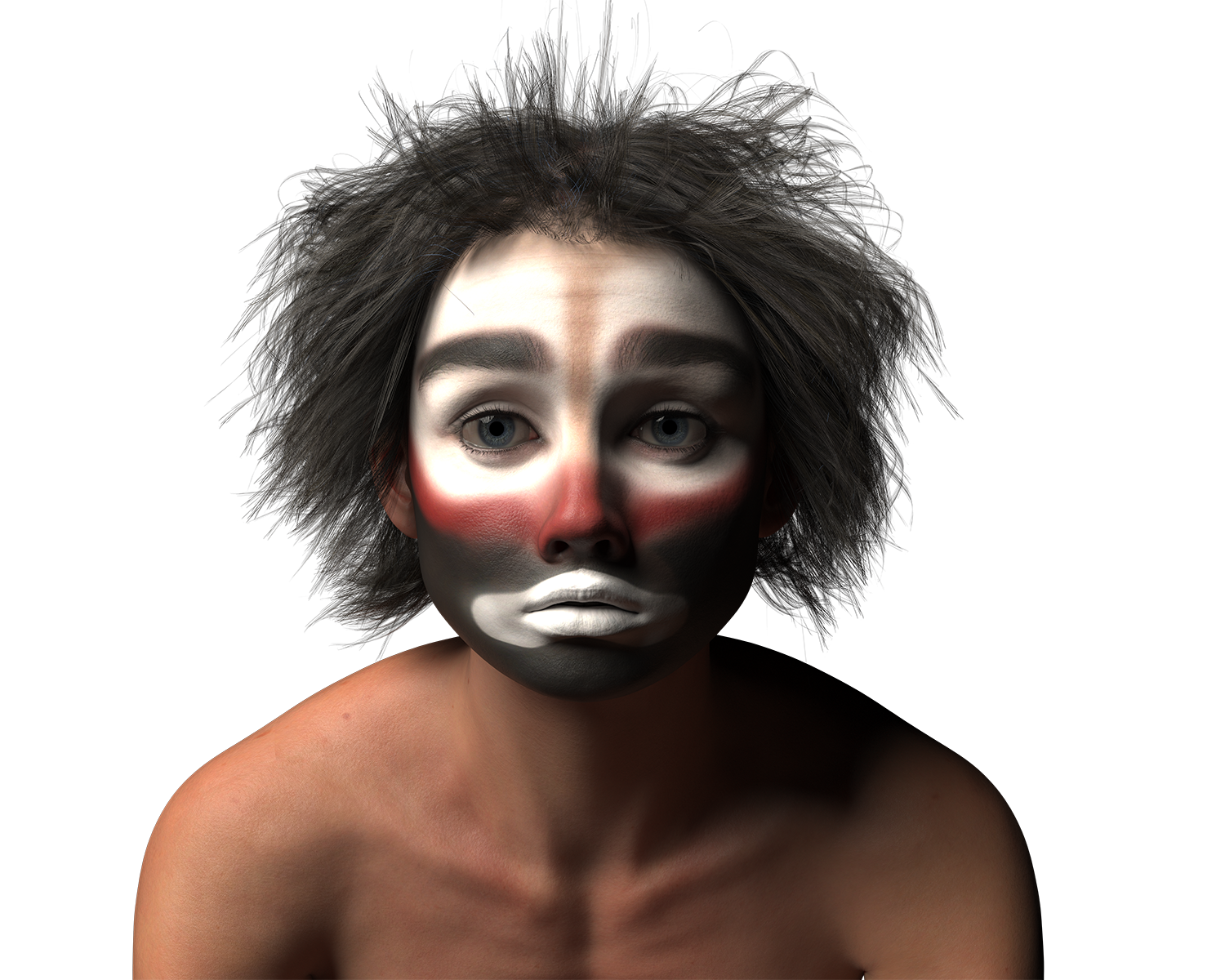I started with my Daz character Zoe. I then took RawArt’s makeup from his Clown Carnival product into Photoshop to edit it. I was creating a sad clown which meant I had to flip the smile upside down for a frown and remove the blue eyebrows because Zoe’s head is so much smaller. (the eyebrows were up at her hairline :-)) Once the clown makeup was edited, I saved it so I could add it as a skin texture in Daz.